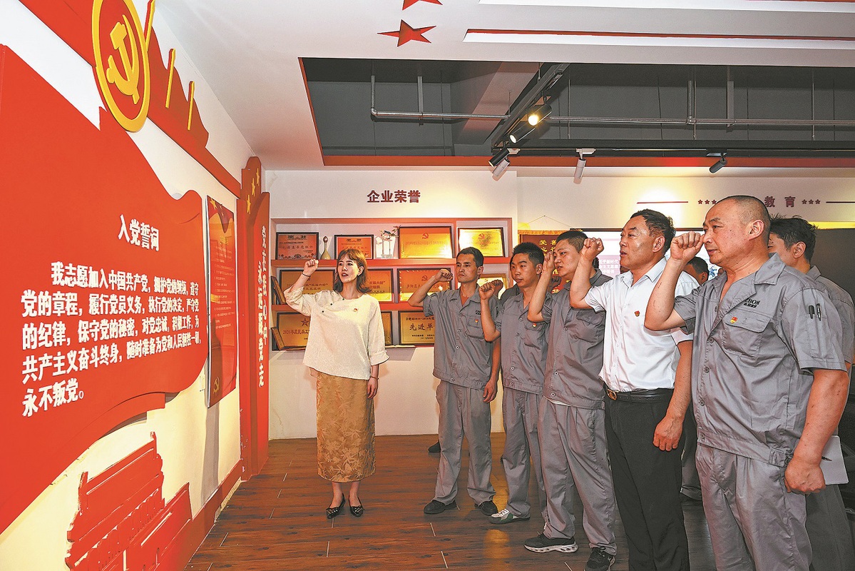 Party members from enterprises review the Party admission oath in Hefei, Anhui, on June 30. ZHAO MING/FOR CHINA DAILY