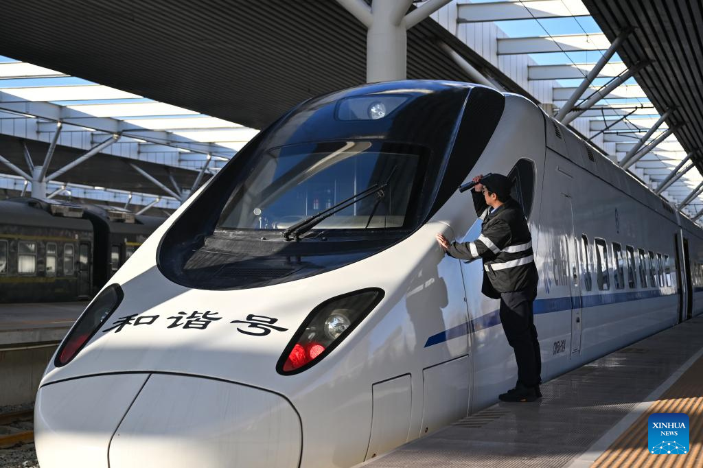 A staff member checks the first train of the Baotou-Yinchuan High-Speed Railway at Baotou Railway Station in Baotou, North China's Inner Mongolia autonomous region, Dec 23, 2025. The Baotou-Huinong section of the Baotou-Yinchuan High-Speed Railway was completed and opened to traffic on Tuesday, marking the full-line operation of the railway. [Photo/Xinhua]