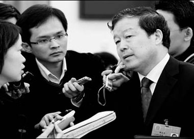 Guo Qingping (right), chief of Bank of China Tianjin branch, talks to reporters yesterday in Beijing after the Tianjin delegation's panel discussion at the 11th NPC. Huo Yan
