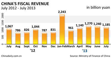 Growth in fiscal revenue at all levels of government continued rising in July, but realizing the full-year target will be an arduous task amid an economic slowdown and pending tax cuts.