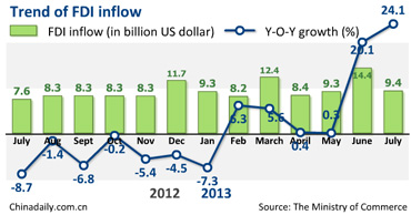Foreign direct investment in China surged 24.13 percent from a year earlier to $9.41 billion in July, the largest expansion since March 2011.
