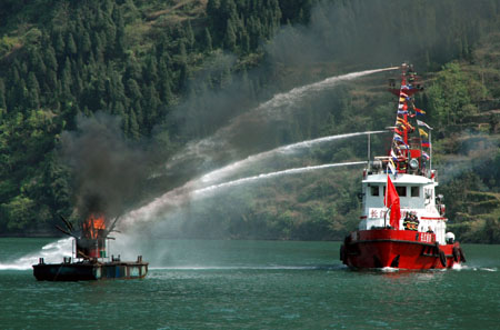 Firefighters spray water from a fireboat onto a ship on fire during an emergency drill in the Three Gorges stretch of the Yangtze River near Yichang, central China's Hubei Province, April 10, 2007. [Xinhua]