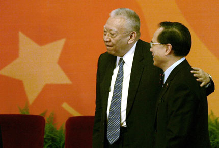 Hong Kong's Chief Executive Donald Tsang (R) and former Chief Executive Tung Chee-hwa talk after the seminar marking the 10th anniversary of the entry into force of the Hong Kong Basic Law at the Great Hall of the People in Beijing June 6, 2007. [Reuters]