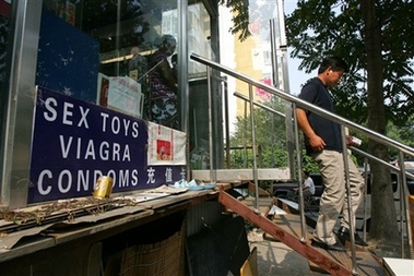A man emerges after buying a pack of cigarettes at a store that also offers viagra in Beijing, China, in this July 2, 2007 file photo. Chinese police have cracked four criminal networks that made fake Viagra, Tamiflu and anti-malaria drugs and sold them within China and to customers in Southeast Asia, the United States and Europe. [AP]
