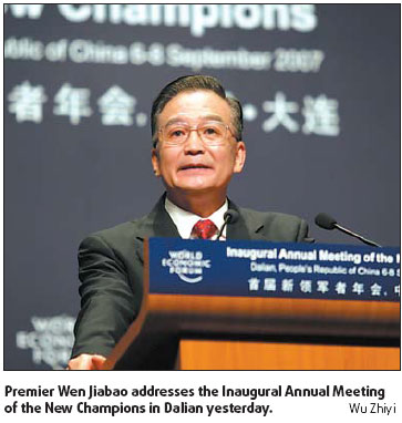 Updated: 2007-09-07 06:21 ![]() Editor's note: Following is the full text of Premier Wen Jiabao's address at the opening session of the Inaugural Annual Meeting of the New Champions of the World Economic Forum's Summer Davos 2007 in Dalian. Dear Professor Klaus Schwab, executive chairman of the World Economic Forum, distinguished guests, ladies and gentlemen, let me start by extending, on behalf of the Chinese government and myself, warm congratulations on the opening of the World Economic Forum Summer Davos 2007 in Dalian and cordial greetings to you. It has been 36 years since the inception of the Forum in 1971. Starting from this year, the Forum will hold an annual Summer Davos in China. This shows the world's increasing interest in China's economic development and the growing cooperation between China and the Forum. The key to the success of the Forum is that political and business leaders, experts and scholars from various countries participate in it with sincere wishes for equality and mutual respect. With a strong sense of responsibility and mission, they are committed to discussing major issues of the world economy, paying greater attention to growth companies, underdeveloped regions and people in poverty, balance, coordination and sustainability of development, and playing an active role in promoting development, progress and harmony of the world. This should be the spirit of the World Economic Forum. The name of this meeting, "The Inaugural Annual Meeting of the New Champions - From Davos to Dalian" and the continued theme of "Shifting Power Equation" are fitting ones and highly relevant as they reflect both the international community's focus on fast-growing companies and regions and its strong desire to establish a new international economic order. Since China's economic development is high on the meeting's agenda, I wish to talk to you about the progress in China's development endeavor. Since it embarked on the path of reform and opening-up nearly 30 years ago, China has seen profound economic and social changes. China has succeeded in transforming itself from a closed and semi-closed planned economy into an open socialist market economy. There has been a great change in the life of the Chinese people, from lack of basic living necessities to moderate prosperity. China has also made important progress in political, cultural and social reforms and remarkable achievements in its modernization drive. From 1978 to 2006, China's GDP registered an annual growth rate of 9.7 percent. During this period, its import and export surged to $1.76 trillion from $20.6 billion, the per capita consumption of its urban and rural population increased by over four times in real terms and the number of poor people dropped to 20 million from 250 million. These achievements were possible because we have embarked on the correct path of development that is suited to China's particular conditions and is in keeping with the trend of the times. On the other hand, I want to tell you frankly that China is still a developing country with a large population, weak economic foundation and underdeveloped productivity. This is a reality that has basically remained unchanged. Although the overall size of China's economy is large, its per capita GDP is ranked behind over 100 countries. Uneven development between urban and rural areas and among different regions is still an acute problem. China, a big country with a population of over 1 billion, has encountered a host of intertwined problems and difficulties in the course of its social transformation. Modernization remains a long-term goal for China. China's economy is on the whole in good shape, marked by sustained and fast growth, sound financial performance, growing trade and rising living standards. But problems such as unstable factors, imbalances and lack of sustainability also affect China's economic development. They include excessively rapid economic growth, acute structural tensions, the inefficient pattern of growth, depletion of resources and environmental degradation, mounting pressure on price and entrenched structural and institutional obstacles. To resolve these problems, we are putting into practice the scientific thinking on development and pursuing an innovation-based model of development. We are committed to a comprehensive, coordinated and sustainable path of development that puts people's interests first. Specifically, we are focusing our efforts on the following areas: Maintain fast yet steady economic growth. Excessive growth of investment in fixed assets, oversupply of credit and loans and sizable trade surplus are major problems in China's current economic development. To resolve these problems, we must give top priority to macro-regulation to prevent an already fast-growing economy from becoming overheated. We will continue to work to strike a balance between promoting economic growth and improving economic structure, between investment and consumption and between domestic and external demand. We will deepen the reform of the financial sector to develop a modern banking system, a comprehensive monetary regulatory mechanism and multi-tiered capital market. We will continue to reform the renminbi exchange rate mechanism to increase its flexibility. We are confident that with enhanced macro regulation, the giant ship of China's economy will continue to surge ahead steadily. Speed up changing the pattern of economic growth. To accelerate economic adjustment and raise the quality and efficiency of economic development is an urgent task facing China. We will follow a new path of industrialization by upgrading and improving industrial structure. We will take enhancing capacity for independent innovation as a key step in changing the pattern of economic growth, strengthen IPR protection and speed up scientific and technological development and improve industrial performance in an all-round manner. The Chinese government takes product quality and