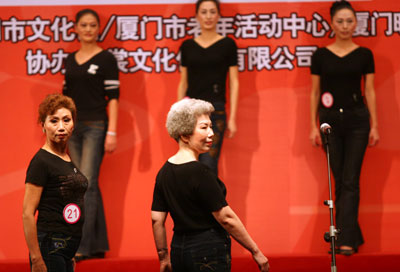 Elders pose on the catwalk during a costume show in Xiamen, East China's Fujian Province October 16, 2007. Fifty-five elders applied to participate in the show with the oldest being 80 years old. [newsphoto]