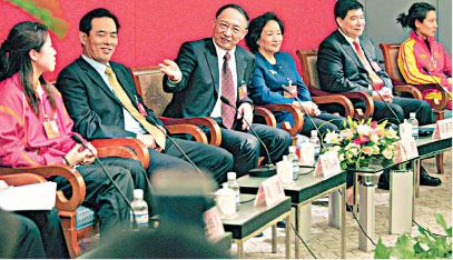 Delegate and volleyball player Zhou Suhong discusses the Party congress report with Lan Xiaojuan, a delegate and vegetable farmer from Jingning She Autonomous County in Zhejiang Province on Tuesday. China News Service
