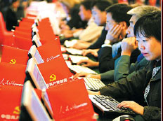 Delegate Wang Guosheng reads the Party congress report on Monday. Li Jinglu