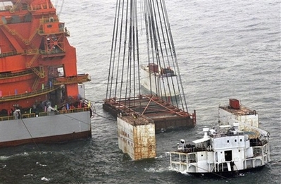 The Nanhai No. 1, which means "South China Sea No. 1," sank off the south China coast with some 60,000 to 80,000 items on board, Xinhua News Agency reported, citing Wu Jiancheng, head of the excavation project. Archaeologists built a steel basket around the 100-foot vessel, and it took about two hours for a crane to lift the ship and surrounding silt to the surface. The basket was as large as a basketball court and as tall as a three-story building. Green-glazed porcelain plates and shadowy blue porcelain items were among rare antiques found during the initial exploration of the ship. Archaeologists have also recovered containers made of gold and silver as well as about 6,000 copper coins. The ship dates from the Song Dynasty (960 -1279). It was discovered in 1987 off the coast near the city of Yangjiang, in Guangdong province, in more than 65 feet of water. The Nanhai No. 1 was placed on a waiting barge. It will be deposited in a huge glass pool at a museum where the water temperature, pressure and other environmental conditions are the same as where it has lain on the sea bed. Feng Shaowen, head of the Yangjiang city cultural bureau, said visitors will be able watch the excavation of the ship through windows on the pool. The recovery of the Nanhai No. 1 was originally scheduled for Saturday, but organizers decided to raise it a day early because of favorable weather. |