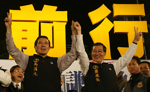Taiwan's Kuomintang (KMT) candidate Ma Ying-jeou(L) and running mate Vincent Siew celebrate victory in the island's leadership election in Taibei March 22, 2008. Ma outlined ambitious plans to recast economic and security ties with the mainland. [Agencies]