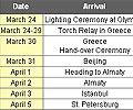 The flame is set to arrive in Beijing on August 6, where it will be paraded around the city until entering the National Stadium for the Olympics opening ceremony on August 8. In addition to visiting cities in Greece and China, relay runners plan to carry the torch to the following cities, listed in the order in which the torch is scheduled to visit: Almaty, Kazakhstan; Istanbul, Turkey; St. Petersburg, Russia; London, England; Paris, France; San Francisco, California, USA; Buenos Aires, Argentina; Dar es Salaam, Tanzania; Muscat, Oman; Islamabad, Pakistan; New Delhi, India; Bangkok, Thailand; Kuala Lumpur, Malaysia; Jakarta, Indonesia; Canberra, Australia; Nagano, Japan; Seoul, South Korea; Pyongyang, DPRK; Ho Chi Minh City, Vietnam. |