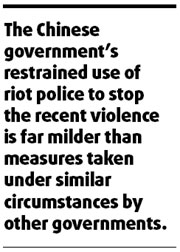 The Chinese government's restrained use of riot police to stop the recent violence in Tibet is not only fully justified; it is similar to, and far milder than, measures taken under similar circumstances by other governments.