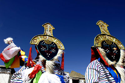 Performers dance at the Tashilunpo Monastery in Xigatse, Tibet Autonomous Region on April 18, 2008. [Xinhua]