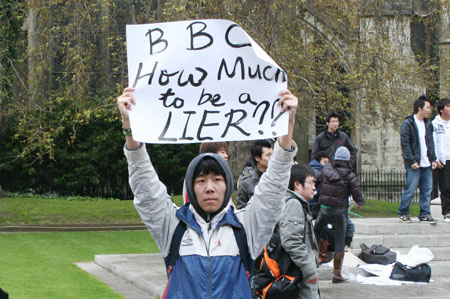 A Chinese student holds a placard to protest BBC's biased reports on the March 14 Lhasa riots in a silence demonstration in London April 19, 2008. [Lei Xiaoxun/chinadaily.com.cn]