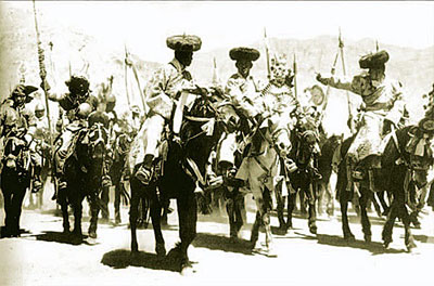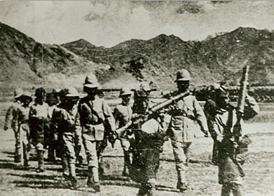 "Tibetan army" refered to the armed forces of the local government of old Tibet. Its highest commanding unit was called dMag-spyi-Ias-khungs and the commander in chief was named dMag-spyi. This degenerate army often vioIated military disciplines, extorted money and committed all sorts of crimes. Therefore, the masses generally called natural d isasters, pestilences and this army "Three Calamities". Above picture was Tibetan troops drilled by the British.