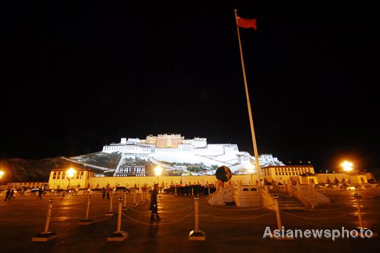 A night view shows the lit-up Potala Palace in Lhasa, Southwest China's Tibet Autonomous Region May 6, 2008. Tibet has reopened its main temples to overseas tourists, including the Potola Palace and the Sera Monastery. [Asianewsphoto]
