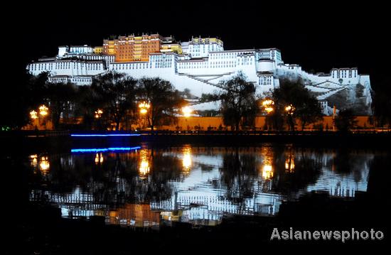 A night view shows the lit-up Potala Palace in Lhasa, Southwest China's Tibet Autonomous Region May 6, 2008. Tibet has reopened its main temples to overseas tourists, including the Potola Palace and the Sera Monastery. [Asianewsphoto]