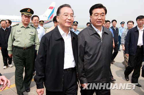 Hu arrived at Mianyang City at Friday noon after more than two hours of flight from Beijing. In the meeting room of the airport, he and Premier Wen Jiabao, who had been directing relief work in the disaster-hit areas since Monday, discussed the quake-relief work.