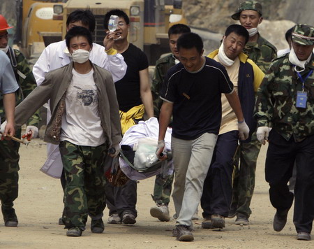 Volunteers carry a survivor from the ruins of a collapsed apartment block in the city of Beichuan, located around 150 km north of Chengdu, in Sichuan Province May 16, 2008. China struggled to bury its dead and help tens of thousands of injured and homeless on Friday when a powerful aftershock brought new havoc four days after an earthquake thought to have killed more than 50,000. [Agencies]
