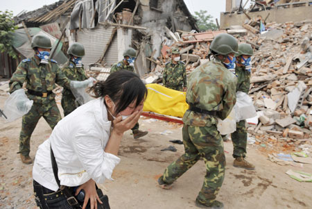 A woman mourns while soldiers carried away the body of her husband near a collapsed building in the earthquake-hit Yinghua town of Deyang, Sichuan province, May 16, 2008. [Agencies]