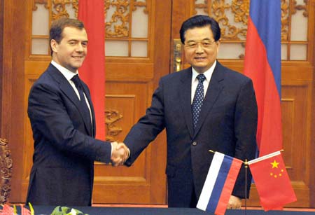 Chinese President Hu Jintao (R) shakes hands with visiting Russian President Dmitry Medvedev after signing the Sino-Russian joint statement on major international issues in Beijing, capital of China, May 23, 2008. [Xinhua]