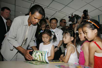 Rice met with quake survivors and toured a relief camp in Dujiangyan, one of the worst hits areas, during her four-hour visit to Sichuan province. She said the American people had responded with sympathy to the quake victims. The US government has offered cash and materials worth $2.6 million as quake relief, according to the Foreign Ministry, and Rice is the highest-ranking US official to visit Sichuan after the quake. "We talk about US-China relations, we talk at the government level, but it is really the relations between the American people and the Chinese people that really make the difference," she said. "I'm really impressed by the recovery effort. It is really a sign of how the human spirit can overcome great devastation." She first visited the Dujiangyan Tengda sports club, reduced to rubble by the quake. It was a popular site with local people, and women used to practise dancing there. The US secretary of state had some light moments too, feeding goldfish in a giant bowl in front of a couple's makeshift home. Rice watched a Peking Opera performance at a cultural center, and talked with some children, whom she called "my friends". "It is good to see people are recovering and going on with their lives, and children are studying and performing," she said before leaving Dujiangyan for Chengdu. She took off from the provincial capital of Sichuan for Beijing at 2 pm. In Beijing, Foreign Minister Yang Jiechi said he hoped to hold a meeting of the Six-Party Talks' chief negotiators soon. "It is proper (time) for a meeting of heads of delegations of the Six-Party Talks because the nuclear process has achieved major progress," Yang said at a joint press briefing with Rice. The Democratic People's Republic of Korea (DPRK) submitted a list declaring its nuclear program to China on Thursday. A day later, it demolished the cooling tower of its Yongbyon nuclear facility. The US has welcomed the DPRK move. Rice praised China's leading role in the Six-Party Talks and the hard work it had done to turn an area of possible conflict into one of cooperation. She said China and the US have developed constructive relationships despite the differences over issues such as human rights. Rice will meet President Hu Jintao and Premier Wen Jiabao today before flying home.