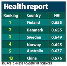 Updated: 2008-10-09 06:58 China ranked 13th on a list ranking international health conditions released by a Chinese Academy of Sciences (CAS) study group Wednesday. The tally uses a Nation Health Index (NHI) combining four branch indexes measuring populations' metabolisms, immunities, nervous systems and behavior, and determined China to be "qualified healthy". "A nation is like a person," CAS' study group leader Yang Duogui said. Yang explained that immunities hinge on ecological conditions, resistance to financial risk and social stability.