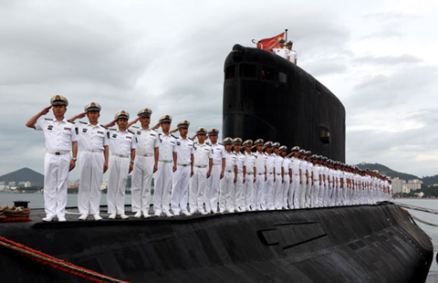 | Crew members of Submarine 372, of the PLA navy's South Sea Fleet, salute in an undated photo. GAO YI/CHINA DAILY |