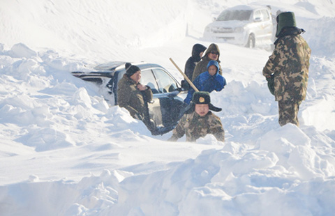 Local people take part in skiing hunting at Hemu Village of Burqin County in northwest China's Xinjiang Uygur Autonomous Region, Jan 1, 2016. Nearly 1 meter thick of snow fall in the village over the past weeks, making trouble, but also bringing fun to locals and tourists. [Photo/Xinhua]