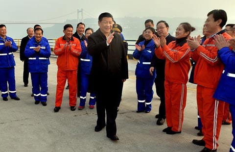 Chinese President Xi Jinping talks with workers during his visit to Guoyuan Port in Southwest China's Chongqing municipality, Jan 4, 2016. Xi made an inspection tour in Chongqing from Jan 4 to 6.[Photo/Xinhua] |