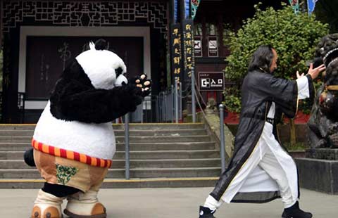 A performer dressed as Kung Fu Panda character Po learns shadowboxing with Taoist master Liu Suibin during DreamWorks' creative team's trip to Mount Qingcheng in Chengdu City, the capital of Southwest China's Sichuan Province, Jan 6, 2016. The mountain is featured in the third installment of Kung Fu Panda. [Photo/China News Service] |