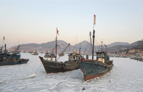Fishing boats are trapped in sea ice in a port at Xikou Village in Yantai City, East China's Shandong province, Jan 26, 2016. Under the influence of a strong cold wave, sea ice appeared around the Yantai sea area and affected the maritime transportation. [Photo/Xinhua]