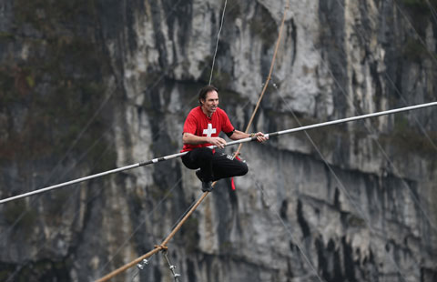 Freddy Nock walks on 300-meter-high steel wire in Wulong county of Southwest China's Chongqing on March 30, 2016. [Photo provided to China Daily] |