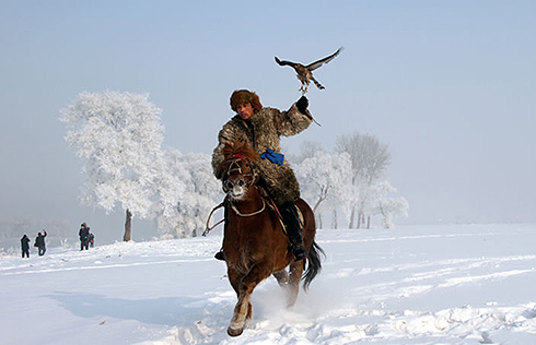 The eagle has long been a totem for Manchu people, the largest ethnic minority in China. Ancestors of the Manchu people, born in China's cold northern areas and raised as hunters, trained eagles as their hunting partners. Eagles, known for their astute instincts and aviation abilities, can be a powerful helping hand for hunters.