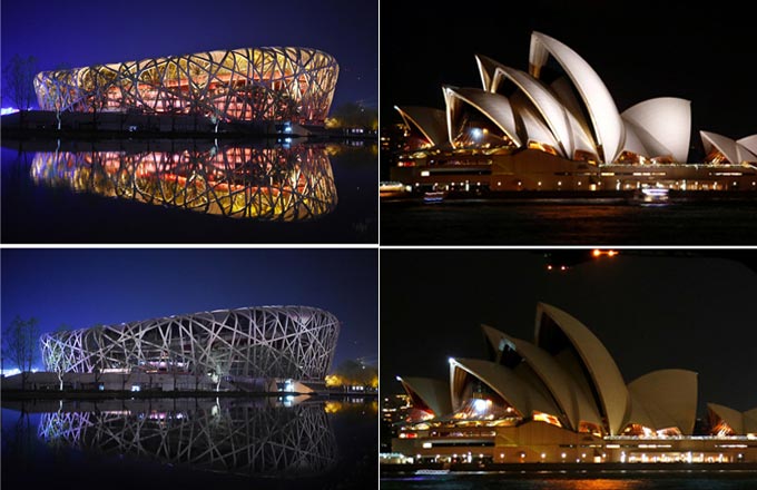 A combo picture shows Beijing National Stadium,also known as Bird's Nest, before (top) and during Earth Hour in Beijing, March 25, 2017. As an environmental campaign, lights are switched off around the world at 8:30 pm on Saturday evening to mark the 10th annual Earth Hour and to draw attention to climate change. [Photo/VCG]