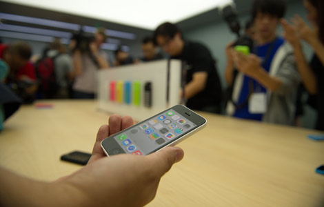 New iPhone 5Cs are displayed at a media event in an Apple Inc office in Beijing on Sept 11, 2013.