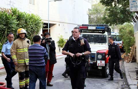 Firefighters work at the venue where a suspected World War II bomb was found by construction workers who were digging underground structure for a hotel on Queen's Road East in Hong Kong island, south China's Hong Kong, Feb 6, 2014.