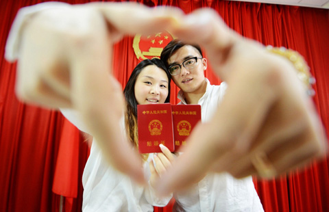 Maidservants in the white dress serve the brides during a group traditional Han wedding in an ancestral hall in Rucheng, central China's Hunan province, May 20, 2015. "May 20" in Chinese language is pronounced similar to "Wo Ai Ni", which means "I love you", and a traditional group wedding for 10 couples was held at the ancestral hall in Rucheng on Wednesday. The ancestral hall is a Chinese temple dedicated to deified ancestors and progenitors of surname lineages or families in Chinese culture. And today the ancestral hall in Rucheng has become the place to protect and inherit the traditional culture. [Photo/Xinhua]