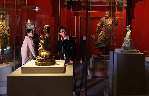 Photo taken on Oct 8, 2015 shows Buddha statues at the new exhibition area at the Palace Museum in Beijing, captial of China. [Photo/Xinhua] |