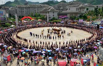 Tens of thousands of people perform drum dance in Guizhou