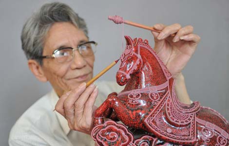 Handicraftsman shows skill of lacquer thread sculpture