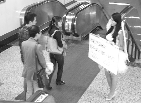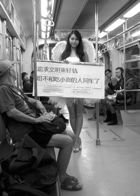 “上午坐輕軌,看見個‘天使’在輕軌車廂里走來走去。”網友“教頭123”在重慶一百度發帖稱,昨日上午11:00左右,他從臨江門坐輕軌到大坪,在車廂內看到了這個“天使”。“穿成這樣我還以為她是在博眼球,推銷什么東西。”“教頭123”說,在“天使”走近后,他才看清牌子上寫的字:“跪求文明乘輕軌,姐不和吃小面的人同車了”,下面還有兩排小字,用TVB體寫著:“吶,坐輕軌呢,最重要的是開心,你這樣吃早餐,我們都不想的。”“吶,別說我沒提醒你,輕軌3號線馬上就要通車了,你們這樣有沒有考慮過我的感受啊!”