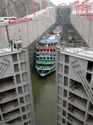 | | A passenger ship sails into the fourth chamber of the permanent ship lock as a gate opens at the Three Gorges Dam in Yichang, Hubei Province, June 16, 2003. The third trial navigation of the Three Gorges Project was pronounced successful as ships passed through the permanent locks Monday morning without hindrance. [Xinhua] |