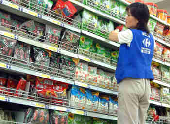 A Carrefour employee in Shanghai restocks the supermarket's shelves with roasted snacks on Friday. They could be the last supplies for a while, after Carrefour is accused of over-charging the seed-and-nut suppliers. [newsphoto.com.cn]