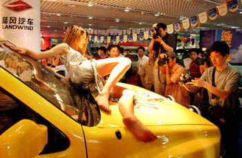 talks with a car model on June 27, 2003 , at the Ningbo Press and Culture