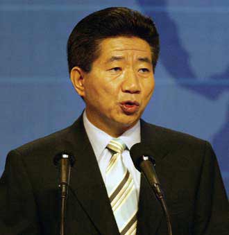 | | South Korean President Roh Moo-hyun makes a speech at an international conference on the economic vision of his administration in Seoul June 30, 2003. Roh, struggling to contain a wave of industrial unrest including the railway network partially crippled by a strike, said on Monday labour action which broke the law would not be tolerated. [Reuters] |