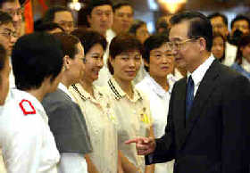 Wen Jiabao talks with medical workers in Prince of Wales Hospital in Hong Kong Monday. [newsphoto.com.cn]