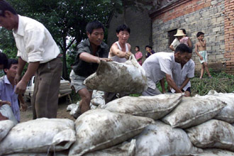 beneath floodwaters on July 6, 2003, after a dyke on Huaihe River dyke was