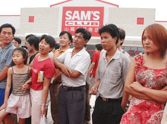 Customers wait for the opening of the Sam's Club store in Beijing's Shijingshan District. The store, which began operation last Friday, is the first Wal-mart outlet in Beijing and the world No 1 retailer's fifth membership store in China. [newsphoto.com.cn]