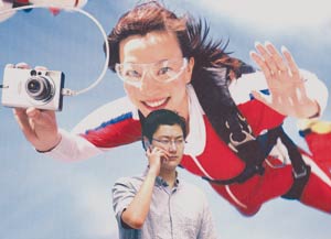 A man chats on his mobile phone in front of a digital-camera advertisement in Shanghai. As they expand abroad, China's electronic producers would face more disputes in intellectual property rights from foreign companies.